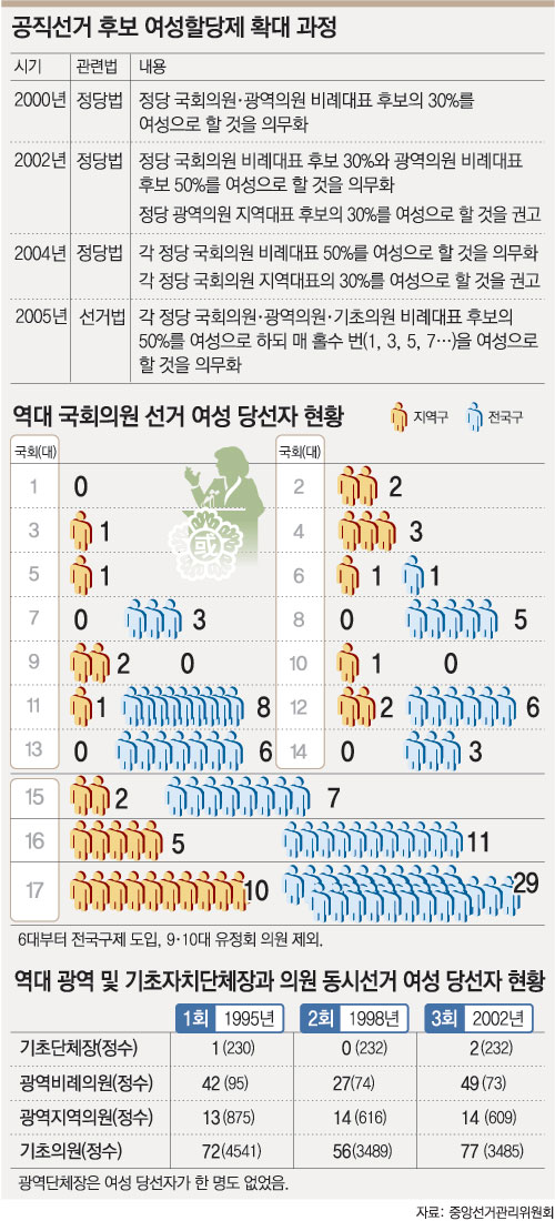▽어정쩡한 여성 배려 제도가 문제=대부분의 여성 정치인은 “여성 배려 제도 자체가 문제가 아니라 제도를 제대로 만들지 못한 게 문제”라며 제도 보완을 통해 ‘여성 배려’를 강화해야 한다는 입장을 보이고 있다.