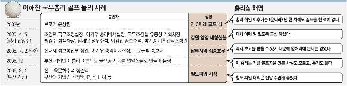 ▽판박이 경위 및 해명=이 총리가 골프 물의를 빚을 때마다 총리실 측은 “이미 오래전에 잡힌 약속이었다”고 했다. 사전 약속이라 어쩔 수 없이 골프를 쳤다는 설명이다. 또 “업무에는 전혀 지장이 없었다”는 해명을 반복했다.