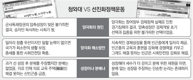 ▽양극화 대책=청와대는 “한국의 기득권층은 아직도 ‘성장이냐 분배냐’의 케케묵은 관념의 틀 속에 갇혀 있다. 분배가 주는 경제 기여도를 인식하지 못하고 있다. 성장 엔진이 좋아도 빈곤층을 위한 사회 안전망(브레이크)이 없으면 선진 사회는 없다”고 주장했다.