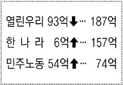 4·15총선에서 열린우리당이 압승했던 2004년도에는 열린우리당과 한나라당의 의원 평균 모금액 격차가 3000만 원대였다. 후원금 상위 20위에도 2004년에 14명이었던 열린우리당 의원이 지난해엔 8명으로 줄었다. 반면 한나라당은 4명에서 9명으로 늘었고, 민노당도 2명이 새로 진입했다.