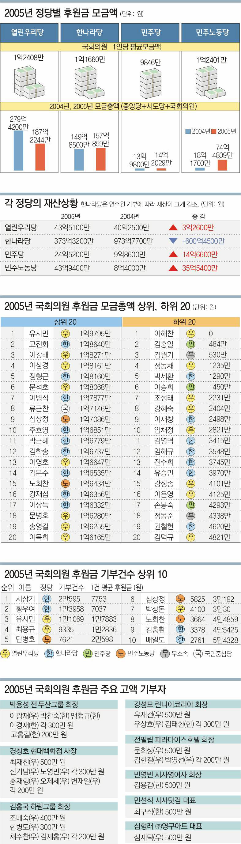 의원과 정당 후원금을 합친 통계에서도 열린우리당은 2004년보다 93억 원이 감소한 187억 원이었다. 반면 한나라당은 전년보다 6억 원 증가한 157억 원을 모금했고, 민노당은 무려 54억 원(270%)이 증가한 74억 원을 모았다. 2004년엔 총선이 있어 후원금 모금이 2배(3억 원)까지 가능했던 것을 감안하더라도 상대적으로 야당의 약진이 두드러져 보인다.