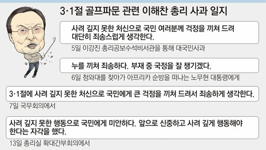 3·1절 골프의 동반자들이 불법 대선자금 제공 등의 전력이 있는 기업인들이었다는 본보의 보도가 나간 다음 날인 5일 이 총리는 처음으로 대국민 사과를 했다. 이어 노무현(盧武鉉) 대통령이 아프리카 순방길에 오른 6일 청와대로 찾아가 대통령에게 사과의 뜻을 전했다. 7일에는 정부중앙청사에서 열린 국무회의에서 또다시 대국민 사과를 했다.