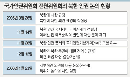 ▽전원위 내부 논의 세 갈래=조영황(趙永晃) 위원장을 제외한 전원위 위원 10명 가운데 8명은 북한 인권 정책에 대해 정부에 의견을 표명해야 한다고 주장했다.