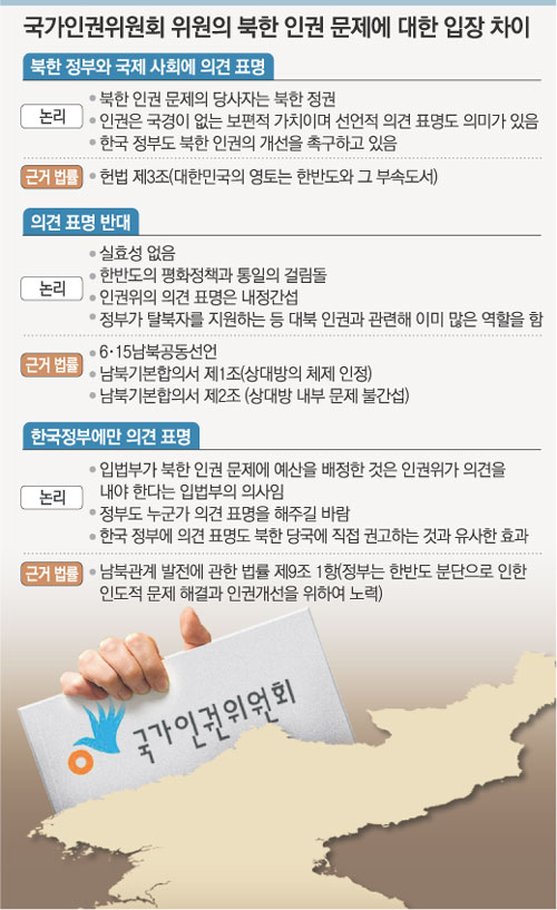 한 위원은 “‘(북한 인권 문제가) 남북 관계에 악영향을 끼치지 않아야 한다’는 전제는 정치적 입장을 떠나 인권 자체를 논의해야 하는 인권위의 역할에 맞지 않는다”고 주장했다.