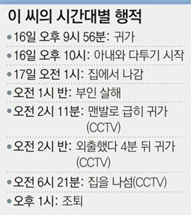 ▽부부 싸움=이 씨는 16일 오후 9시 56분경 범행 현장에서 500m가량 떨어진 서울 동대문구 휘경동 자신의 아파트에 귀가했다. 몇 분 뒤 부부 싸움이 시작됐다.
