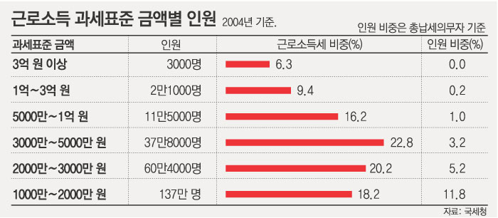 국세청에 따르면 2004년 근로소득세 납세의무자는 총 1162만4000명. 이 가운데 626만8000명(53.9%)이 과세대상이다.
