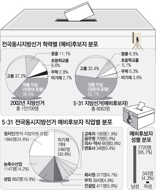 이날까지 중앙선거관리위원회에 등록한 예비후보자 중간집계 결과 대졸자는 36.9%(2978명)이며, 대학원을 졸업하거나 수료한 사람은 15.2%(1220명)이다. 1998년 첫 번째 전국동시지방선거 때 대졸 이상 후보는 31.8%였고, 2002년에는 그 비율이 36.6%였다. 과거에 비해 고학력화가 두드러진 것.