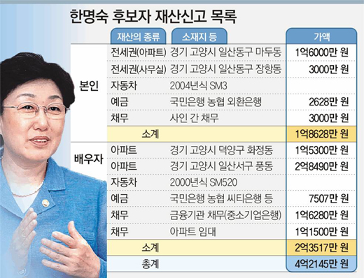 임명동의안과 함께 제출된 한 후보자의 재산 신고 목록에 따르면 한 후보자는 자신 명의의 재산으로 모두 1억8628만 원을 신고했다. 경기 고양시 일산동구 마두동에 위치한 아파트 전세금 1억6000만 원, 사무실 전세금 3000만 원, 국민은행 농협 외환은행 예금 2628만 원, 개인 빚 3000만 원 등이다.