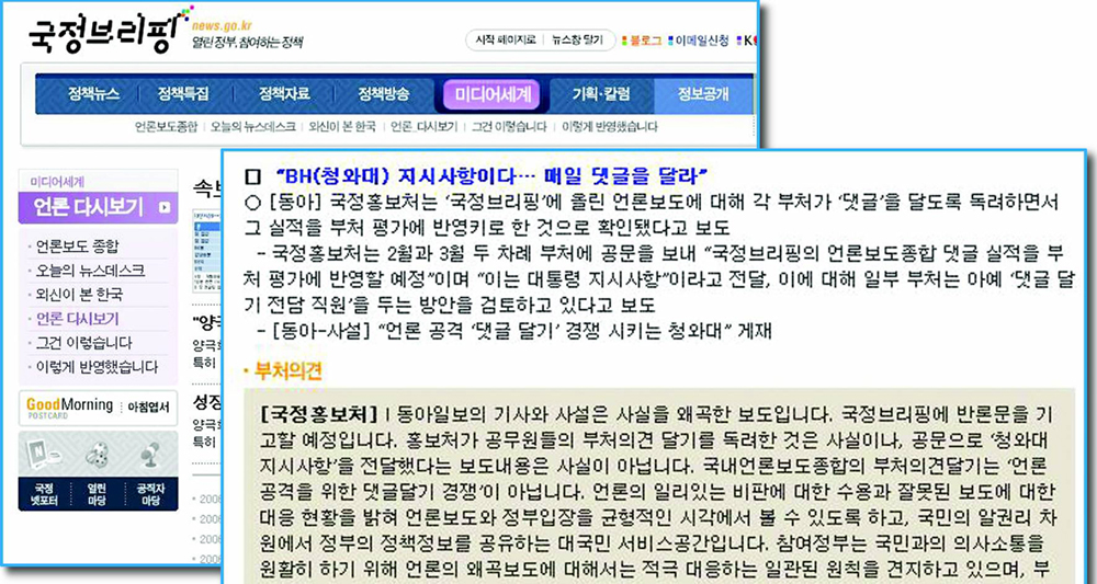 5일 여러 명의 정부 관계자에 따르면 국정홍보처는 2월 10일과 3월 30일 모든 부처에 공문을 보내 “국정브리핑의 언론보도종합 댓글 작성 현황을 매일 오전, 오후 2회 점검해 댓글 실적을 부처 평가에 반영할 예정”이라며 “이는 대통령 지시 사항”이라고 전달했다.