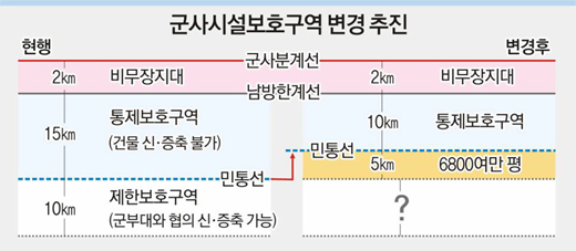 이와 함께 후방지역에서도 군사시설별로 보호구역 설정 범위가 축소돼 2000여만 평이 보호구역에서 해제된다. 후방의 통제보호구역은 군사시설 최외곽 경계선으로부터 500m에서 300m로, 제한보호구역은 시설물 최외곽 경계선으로부터 1km에서 500m로 각각 줄어들게 된다.