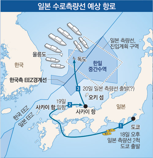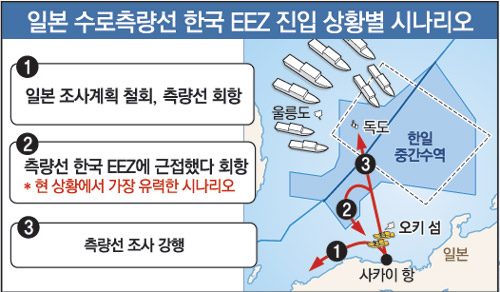 일본 측량선이 한국 측 EEZ를 침범하지는 않지만 독도 근해에 다가오기만 해도 한국 측은 수십 척의 경비정을 동원해 최악의 상황에 대비할 수밖에 없다.