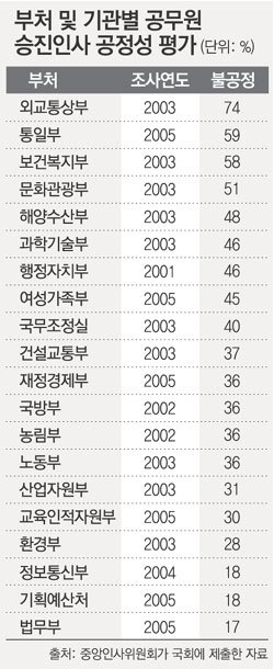 지난해 통일부의 경우 응답자의 59%가 승진이 불공평하다고 평가했으며 2003년 보건복지부의 경우도 승진인사의 불공정 답변 비율이 58%로 비교적 높았다.