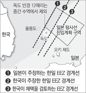 당시 일본은 독도를 기점으로 독도와 울릉도의 중간선을 EEZ 경계선으로 주장했다. 한국은 당시 울릉도를 기점으로 울릉도와 일본 오키(隱岐) 섬의 중간선을 주장했다.