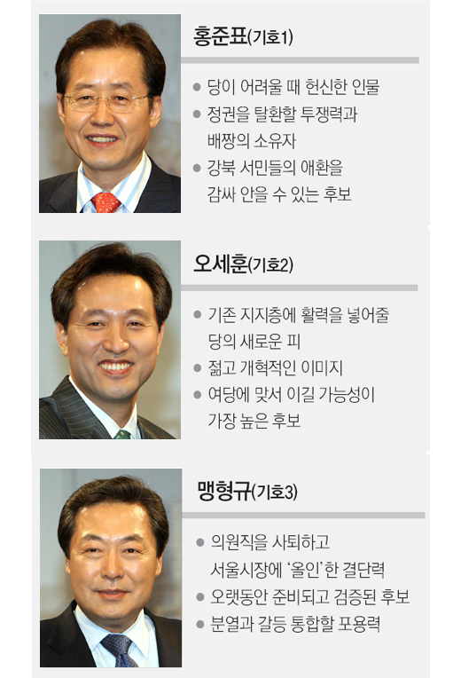 ▽후보들의 마지막 호소=기호 순으로 홍준표(洪準杓·52) 의원과 오세훈(吳世勳·45), 맹형규(孟亨奎·59) 전 의원 등 3명의 주자는 경선을 하루 앞둔 24일 저마다 열린우리당의 서울시장 후보로 유력한 강금실(康錦實) 전 법무부 장관을 누르고 정권 교체의 발판을 마련할 수 있는 후보임을 자처하면서 마지막 표 다지기에 혼신의 힘을 다했다.