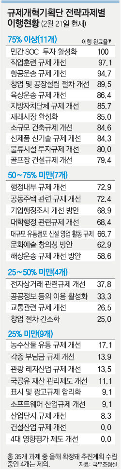 건설 산업분야의 규제 개선과 4대 영향평가제도 개선은 전혀 이행되지 않았으며 소프트웨어 산업규제 개선, 표시 및 광고규제 합리화, 산업단지 규제 개선 등은 이행 완료율이 10% 미만이다.