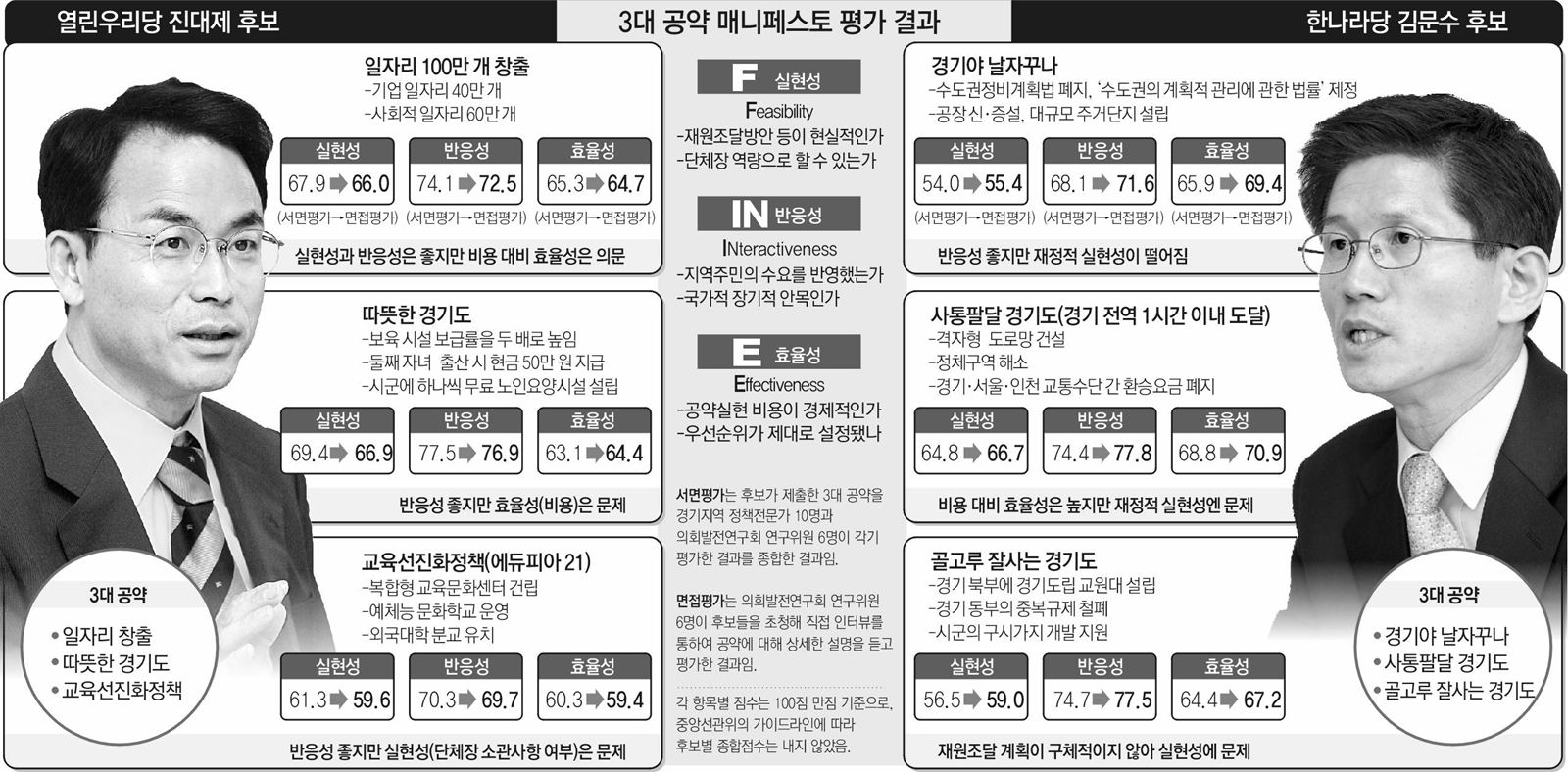 진 후보의 경우 보육 및 노인 복지시설 확충 등을 내세운 ‘따뜻한 경기도’ 정책이 실현성(Feasibility) 면에서 높은 점수를 받았다. 지역 주민의 요구를 잘 반영했다는 점에서 반응성(INteractiveness)도 높게 평가됐다.