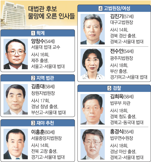 ▽학계 출신 대법관 유력=검찰 출신인 강 대법관 자리에는 역시 검찰 출신인 김희옥(金熙玉·사법시험 18회) 법무부 차관과 홍경식(洪景植·사시 18회) 법무연수원장이 후보로 거론되고 있다.