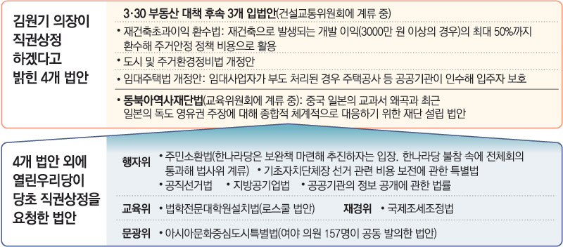 이에 앞서 김 의장 측은 “열린우리당 김한길 원내대표가 직권상정을 요청한 12개 법안 가운데 민생과 국익 관점에서 시급한 처리가 절실하다고 판단되는 4개 법안을 추렸다”며 “4월 임시국회가 끝나는 2일 오후 2시 본회의 때 4개 법안을 직권상정하겠다”고 밝혔다.