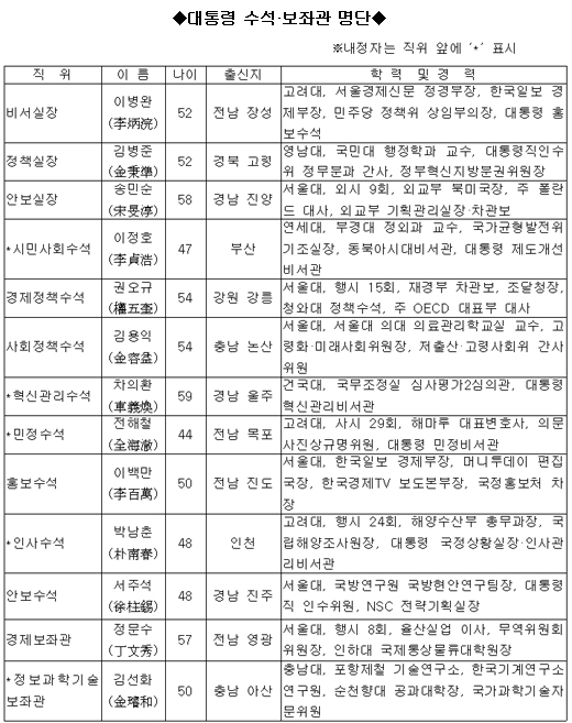 청와대 관계자는 "새 수석들은 모두 임명장을 받는 날부터 별도의 학습기간이 필요없이 곧바로 수석업무를 볼 수 있는 분들"이이라고 설명했다.