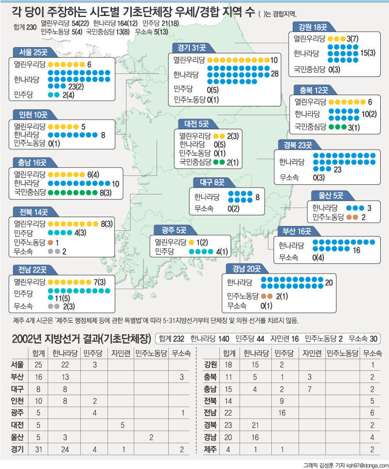 특히 서울의 경우 2002년 지방선거 때는 서울시장 선거에서 이긴 한나라당이 25개 구청장 선거 중 22곳을 싹쓸이했다. 1998년에는 국민회의가 서울시장과 19개 구청장을 석권했다.