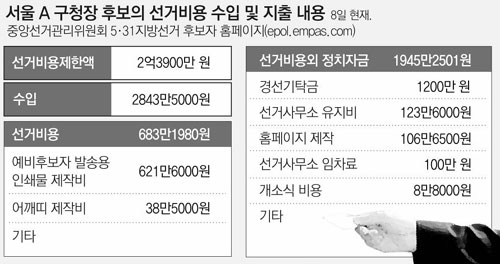경남의 한 기초단체장 후보 측은 지지자들이 가끔 선거사무소 운영비로라도 쓰라며 3만∼5만 원이 든 봉투를 건네면 “떡이나 음료로 가져오시라”고 거절하고 있다. 아무리 적은 돈이라도 차용증 같은 증빙자료를 갖춰 개인채무로 하지 않으면 불법정치자금이 돼 당선되더라도 나중에 선관위 실사에 걸리면 당선무효가 되기 때문이다.