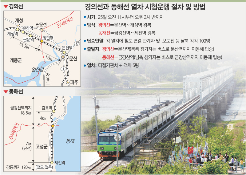 경의선의 경우 문산역에서 남측 열차가 출발하고, 동해선에선 금강산역에서 북측 열차가 출발한다. 각 열차엔 남북에서 철도 연결 관계자와 보도진 등 100명씩이 탑승한다.
