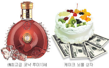 '밍크털로 장식된 로베르트 까발리 코트(650만원 상당), 양주 루이13세(300만원), 샤넬 핸드백(230만원), 테두리가 밍크로 된 세이블 캐시미어 숄(100만원), 발렌티노 숄(30만원), 발렌티노 스카프(50만원), 구찌 머플러(40만원), 페라가모 넥타이 2개(24만원).'