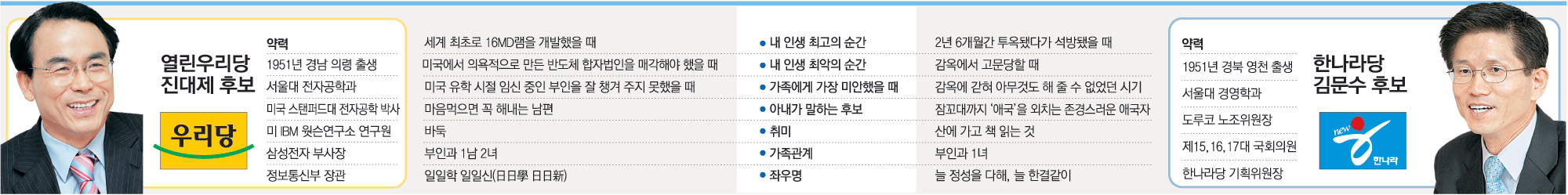 진 후보 선거 캠프의 한 관계자는 “어려웠던 어린 시절의 반작용 때문인지 1등주의, 실적주의, 성적주의에 집착하는 경향이 있다. 그러다 보니 가끔은 ‘덜 인간적’이란 느낌이 들 때도 있다”고 말했다. 그는 고교 시절 서울 용산구 이촌동 철거민촌 판잣집에서 살았고 “10원짜리 삼립 크림빵을 못 사는 게 제일 슬펐다”고 술회할 만큼 혹독한 가난을 겪었다.