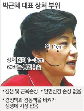 의료진은 안면신경을 건드릴 우려가 있는 민감한 부위인 점을 감안해 전신마취를 권했지만 박 대표가 “약을 써서 의식을 잃고 싶지 않다”고 거부해 국소마취만 했다. 박 대표는 의료진이 권한 진통제도 거부하고 수술에 응한 것으로 알려졌다.