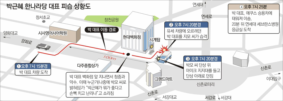박 대표는 오후 7시 15분경 유세장에서 마포구 동교동 방향으로 100m가량 떨어진 횡단보도에 도착했다. 자신의 에쿠스 승용차에서 내린 박 대표는 당직자, 경호팀 등과 함께 빠른 걸음으로 횡단보도를 건너 백화점 앞 유세 차량 쪽으로 갔다.