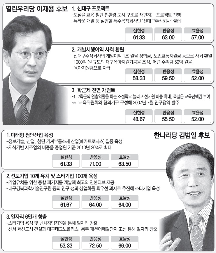 본보와 한국의회발전연구회(이사장 오연천 서울대 교수)는 22일 이재용, 김범일 후보의 3대 공약을 매니페스토(참공약 선택하기) FINE 기법에 근거해 평가했다.