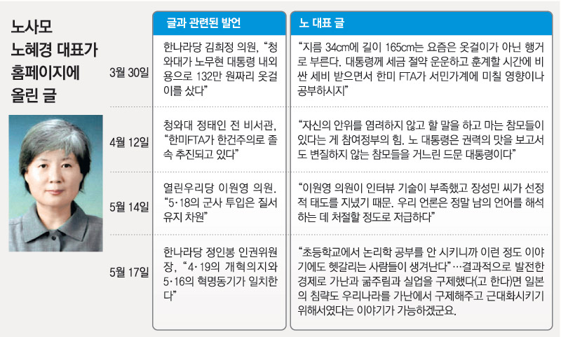 노 대표는 그동안 정치인들의 논쟁이 될 만한 발언에 대해 노사모 홈페이지에 거침없는 글을 올려 왔다. 그는 자신의 편은 감싸고 자신의 생각과 반대되는 측은 비난한다는 평을 받고 있다.