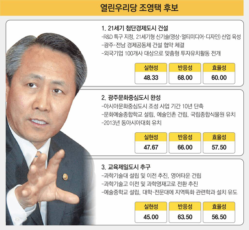 ‘21세기 첨단경제도시 건설’ ‘광주문화중심도시 완성’ ‘교육 제일 도시 추구’ 등 조 후보의 공약은 대체로 지역주민의 반응성은 높았으나 실현성은 떨어진다는 평가를 받았다. 다른 후보에 비해 공약 하나하나가 담고 있는 내용이 많아 재원 조달 방안과 시간 계획 측면에서 낮은 평가를 받을 수밖에 없었다는 지적이다.