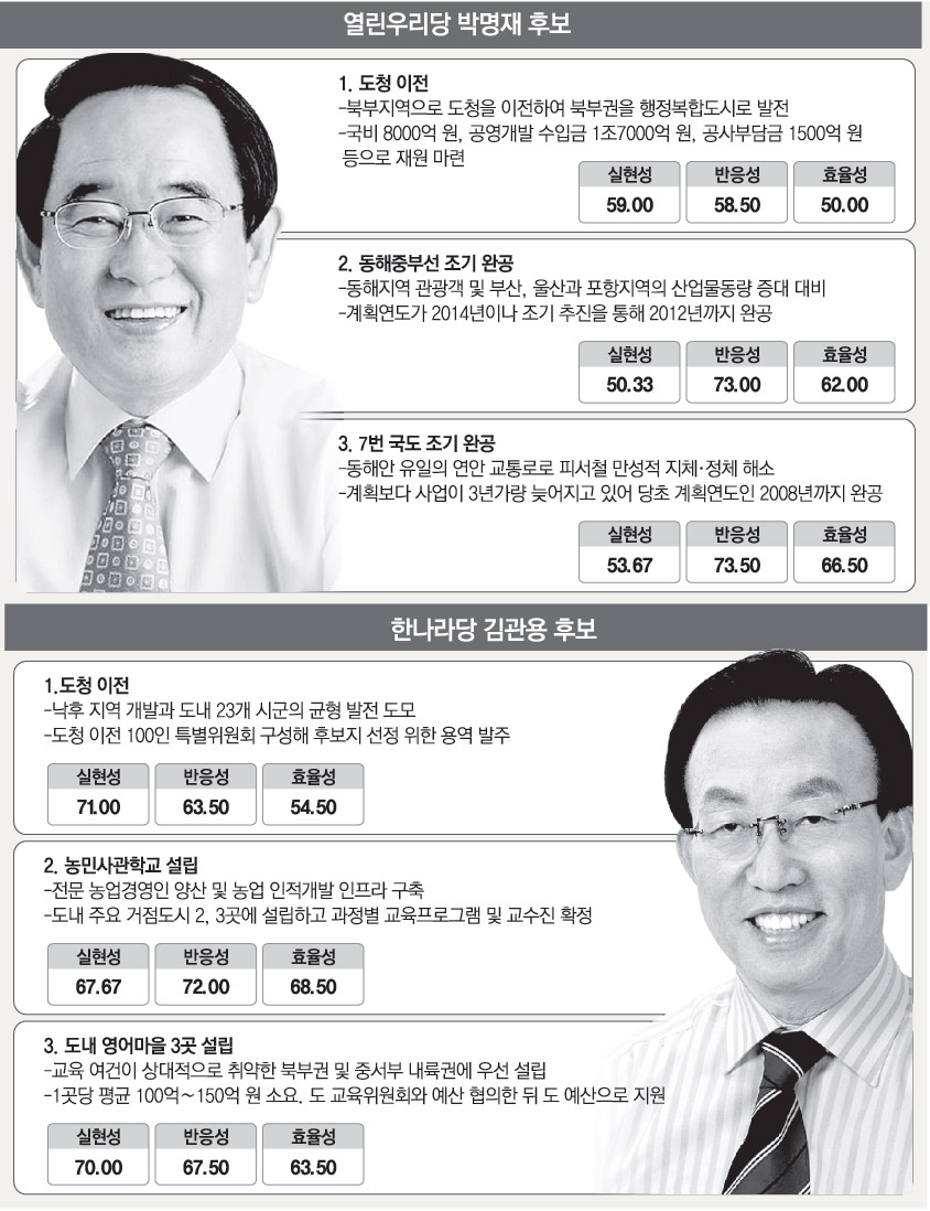 도청 이전 공약은 실현성 반응성에서 비교적 무난한 평가를 받았지만 정책의 우선순위가 적절한지 등을 따지는 효율성 점수는 낮았다.