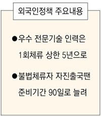 법무부 관계자는 “외국인 근로자와 결혼 이민자의 꾸준한 증가 등으로 국내 체류 외국인이 국민 100명당 1.7명(4월 말 현재 82만 명)을 넘어섰다”며 “한국은 급속히 다문화 사회로 변하고 있어 외국인 정책의 변화가 불가피하다”고 말했다.