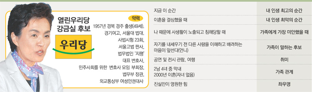 열린우리당 강금실 서울시장 후보가 유권자들에게 보낸 선거 공보물에 소개한 자신의 양면이다. 강 후보는 한마디로 규정하기 어려운 사람이다. 스스로도 “상처도 많고, 영광도 많다”고 했다.