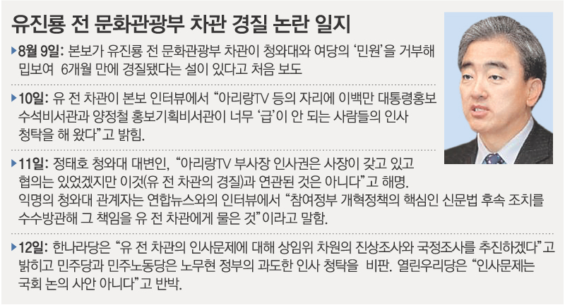 다른 청와대 관계자는 이날 익명으로 “유 전 차관이 참여정부 개혁정책의 핵심인 신문법 후속조치를 방기했기 때문에 경질된 것”이라고 부연 설명했다.