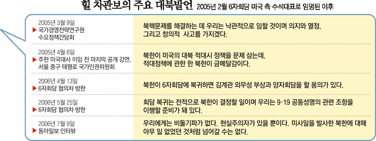 북한에 대해 사실상 희망을 접었다는 취지의 발언도 했다. 힐 차관보는 “북한이 6자회담에 돌아오고 싶어한다고 믿고 싶다. 하지만 그 같은 희망이 미국 외교정책의 기본이 될 수는 없는 것 아니냐”고 반문했다.