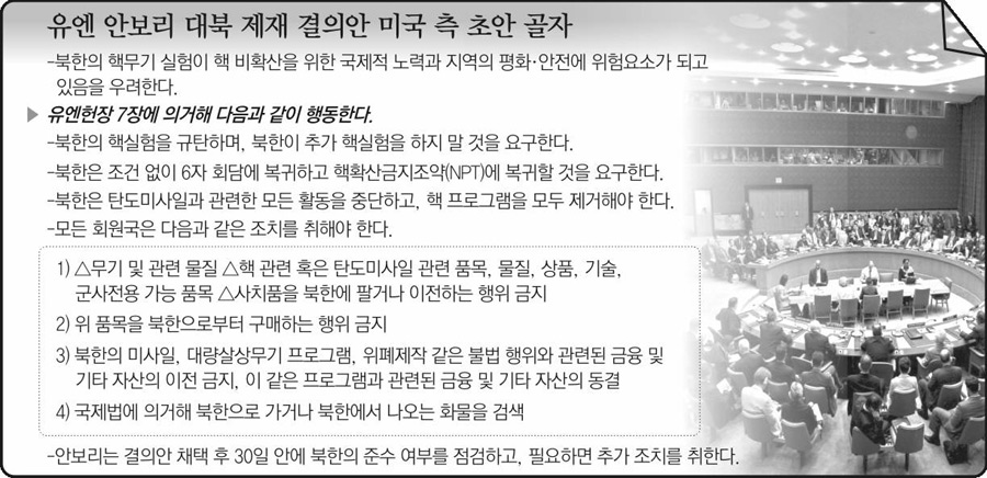 강경파인 존 볼턴 유엔 주재 미국대사가 주도한 이 초안은 북한의 의심쩍은 대외교역 및 자금거래를 제한하는 내용으로 채워져 있다. 유엔 회원국의 강제 이행 의무를 뜻하는 ‘안보리가 이렇게 결정한다(decides)’라는 표현도 쓰였다.