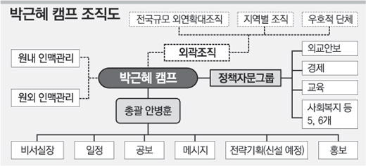 일정 관리는 김선동 전 대표실 부실장이 맡고 있다. 메시지팀은 박 전 대표의 대표 시절부터 원고를 담당해 온 조인근 팀장, 정호성 국회 보좌관, 코미디 작가 출신 최진웅 씨로 구성돼 있다. 이재만 보좌관은 정책 조율, 이춘상 보좌관은 인터넷과 팬클럽을 관리한다. 공보는 이병기 여의도연구소 고문과 구상찬 이정현 신동철 특보, 경호와 수행은 안봉근 보좌관이 맡고 있다.