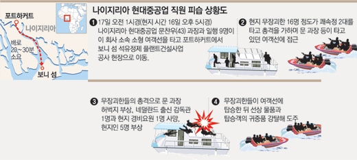 외교통상부 등에 따르면 17일 오전 1시경(현지 시간 16일 오후 5시경) 나이지리아 남부 니제르델타 지역 포트하커트에서 석유정제 플랜트 건설사업 현장인 보니 섬으로 이동하던 현대중공업 소속 여객선을 2척의 배에 나눠 탄 10여 명의 무장 괴한들이 총을 쏘며 습격했다.