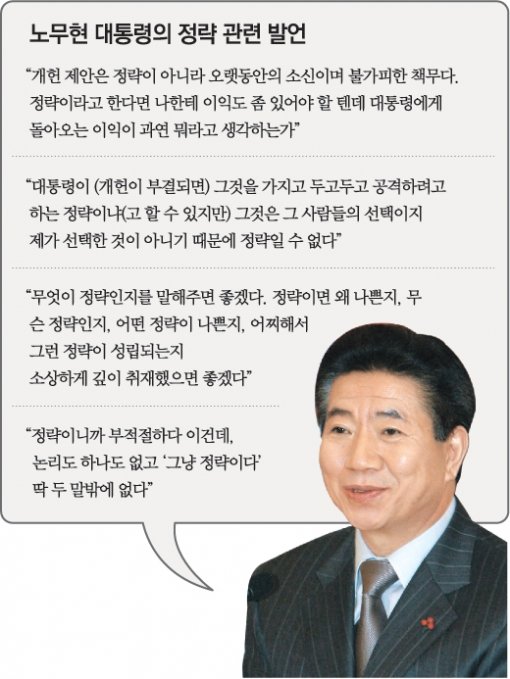 무엇보다 수많은 민생 현안을 제쳐 두고 유독 개헌이 가장 시급한 문제라고 노 대통령이 주장하는 것은 그의 정치적 ‘선택과 집중’에 따른 것이다. 대통령의 권한으로 이를 일방적으로 밀어붙이는 것은, 그래서 어느 의미에서든 정략과 무관할 수 없는 일이다.