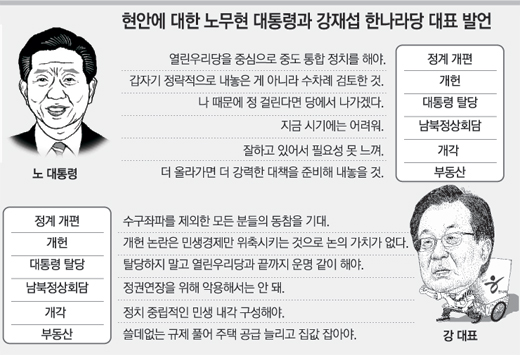 지난해 11월에는 노 대통령이 여야정 정치협상회의를 제안했으나 강 대표가 “그런 협상이 이 시점에 왜 필요한지 모르겠다”며 거절했다.