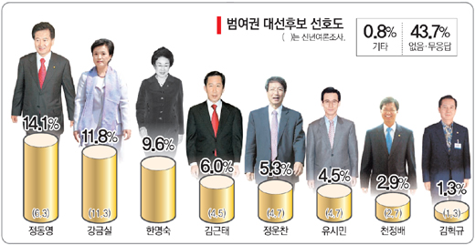 범여권 대선후보 선호도는 정 전 의장(14.1%) 강금실 전 법무장관(11.8%) 한명숙 총리(9.6%) 김근태 열린우리당 의장(6.0%) 순이었다. 신년여론조사에서는 고 전 총리(32.7%) 강 전 장관(11.3%) 정 전 의장(6.3%) 순이었으나 고 전 총리 불출마 선언 후 정 전 의장이 1위로 올라섰다.
