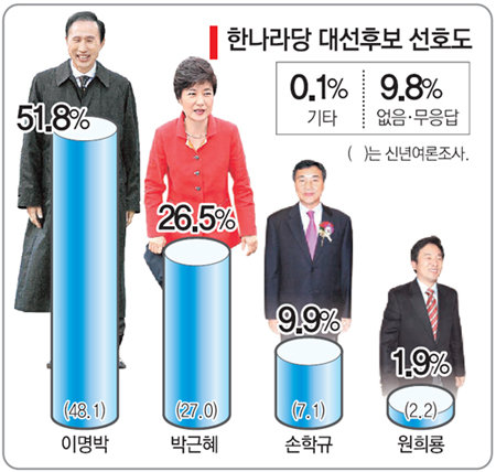 ▽고건 전 총리 불출마로 정 전 의장 유리해져=‘한나라당 대선후보로 누가 낫겠냐’는 선호도 조사에서 이 전 시장은 신년여론조사(48.1%)에 비해 3.7%포인트 오른 51.8%였다. 특히 한나라당 지지자의 이 전 시장 선호도는 같은 기간 49.8%에서 55.1%로 5.3%포인트 올랐다.