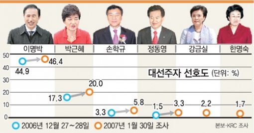 지난달 16일 고건 전 국무총리가 대선 불출마 선언을 하기 전에 실시(2006년 12월 27, 28일)한 본보 신년여론조사 결과와 비교할 때 이 전 시장(1.5%포인트)과 박 전 대표(2.7%포인트), 손 전 지사(2.5%포인트), 정 전 의장(1.8%포인트)의 선호도가 조금씩 올랐다. 고 전 총리 지지층이 비교적 고르게 분산된 결과로 분석된다.