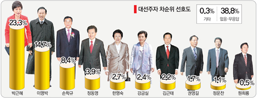 두 번째로 지지하는 후보를 묻는 질문에 박 전 대표(23.3%), 이 전 시장(14.7%)이 1, 2위를 차지했다. 1순위로 이 전 시장을 지지한 사람들 가운데 45.9%가 두 번째로 박 전 대표를 선호했고 박 전 대표의 지지층 가운데 51%가 이 전 시장을 두 번째로 선호해 각각 차순위 선호도가 가장 높았다.