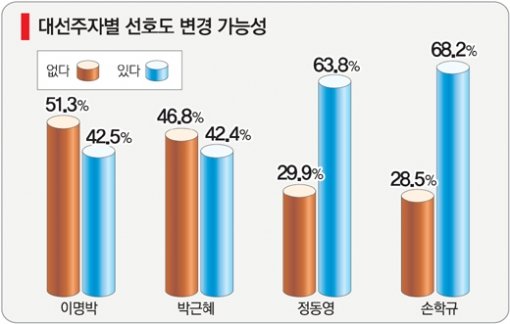 박 전 대표와 이 전 시장의 지지층 가운데 ‘지지후보를 바꿀 가능성이 있다’고 응답한 사람은 2월보다 각각 8.9%포인트, 6.6%포인트 줄었다.