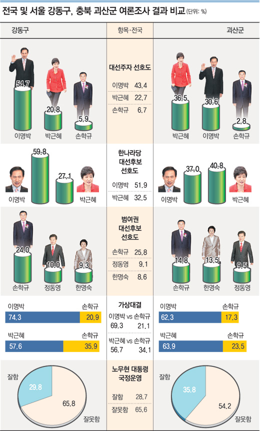 대선주자 가상 대결에서도 박 전 대표와 손 전 지사의 전국 평균은 ‘56.7% 대 34.1%’였지만 괴산에서는 ‘63.9% 대 23.5%’였다. 반면 이 전 시장과 손 전 지사 대결에서는 이 전 시장이 62.3%로 전국 평균(69.3%)보다 낮았고 태도 유보층도 20.4%로 전국 평균(9.6%)이나 강동구(4.8%)보다 많았다.