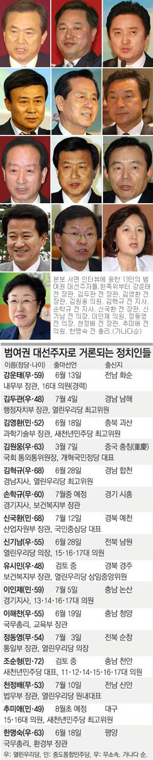 본보는 이들 중 이해찬 전 국무총리를 제외한 13명과 서면 인터뷰를 했다. 이 전 총리 측은 “아직 캠프에서 논의 중인 내용들이 많다”며 인터뷰에 응하지 않았다. 출마를 검토 중이라고 밝힌 유시민 전 보건복지부 장관, 중도통합민주당 조순형 의원도 서면 인터뷰 요청을 거절했다.